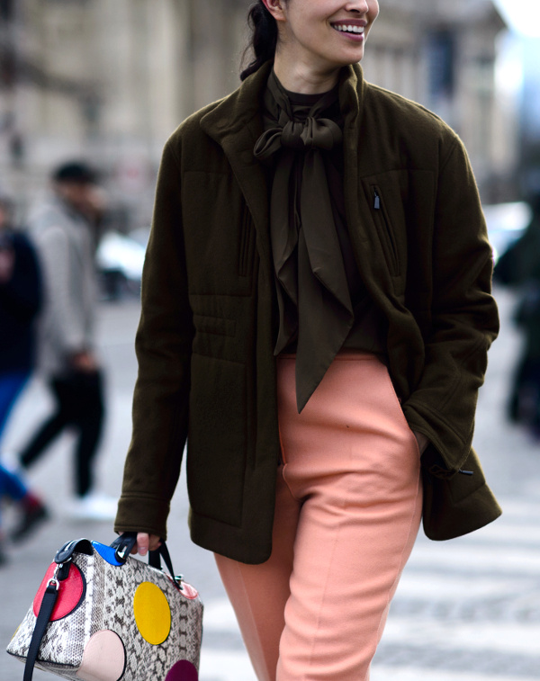 Choisir ses costumes masculins dans une teinte pastel (voir ici et là). Marier kaki et rose pâle (voir ici). Faire la part belle aux trenchs ou manteaux imprimés permettant de sauver n'importe quel look de l'ennui (voir ici, ici, ici, ici et là). Exacerber la féminité de ses amples jupes midi en les portant avec une paire de délicats escarpins (ou sandales) (voir ici). Profiter de l'été pour porter des robes joyeusement girly/folk (voir ici). Dérider ses tenues chics en les réchauffant au creux d'une doudoune de caractère (voir ici et là). Extraire de l'anonymat un look classique en chaussant une paire de bottines imprimées (voir ici). Apposer une pièce monochrome sur une tenue imprimée, permettant ainsi de rendre plus subtile l'ensemble de la tenue (voir ici, ici et là).