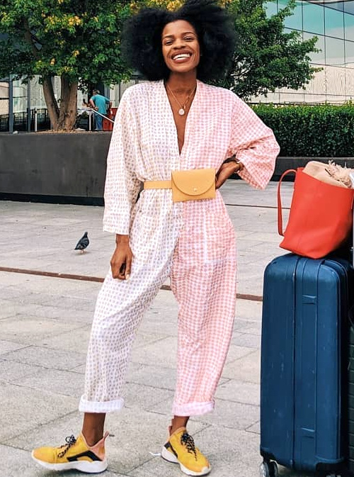 Merci pour la découverte, j’adore ! Son style féminin, ses associations de couleurs, son sourire ! Et c’est la première fois que je vois un look avec sac banane qui me fasse envie !