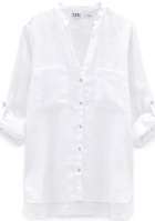 La chemise se portera glissée sur le devant du short. La finesse de la sandale permettra d'apaiser la dimension sportswear du short. On pourra porter ce look avec un sage chignon bas, une queue de cheval haute ou une couronne de tresses coiffée/décoiffée.