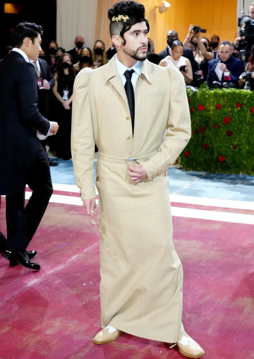 Souhaitant coller au plus près du thème de la soirée, nombreuses furent celles qui se laissèrent séduire par des atours aux reflets 24 carats. Et si Sara Sampaio tira joliment son épingle du jeu en misant sur un fourreau Michael Kors aussi chic que sensuel, on regrette qu'Amber Valletta ait cherché à faire écho à la dimension graphique de sa robe vintage Azzaro en adoptant un carré sévère et une gestuelle anguleuse rendant son allure générale un brin rigide, mais aussi que Rachel Brosnahan (en Joseph Altuzarra) et Megan Thee Stallion (en Moschino) aient pensé que la teinte préférée du roi Midas se devait - pour espérer briller - d'être associée a des effets matières et autres découpes alambiquées. Tenter - en un temps record - de rendre photogénique la traîne des invitées n'a pas dû être de tout repos… (Jodie Turner-Smith en Gucci, Shalom Harlow en Ralph Lauren). En revendiquant avoir volontairement perdu 7 kilos en 3 semaines afin de pouvoir se glisser dans la robe de Marylin Monroe, Kim Kardashian laisse une nouvelle fois ses obsessions fashion prendre le pas sur le bien-être de son corps (on se souvient notamment de sa tenue en scotch qui ne lui permettait que très peu de mouvements). Une attitude qui, si elle s'avère complètement raccord avec l'usage du corset cher au fameux "gilded age" américain, n'en dénote pas moins avec l'actuelle philosophie "body positive"... On regrette que le turban accompagnant la tenue Gucci de Jessica Chastain ne fut pas mieux disposé (voir ici). Positionné légèrement plus haut sur le front, il aurait permis de dégager le visage et d'alléger visuellement l'ensemble de la silhouette. Bella Hadid semble avoir confondu le bal du Met avec le salon des jeux vidéos celtiques à tendance SM (voir ici). Blake Lively offrit ses lettres de noblesse au concept de la robe 2 en 1 ! (avant/après) Les extensions capillaires de Kaia Gerber n'ont rien à envier à celles des poupées "Dame Boucleline et les Minicouettes" de notre enfance. L'intensité des ondes positives émanant du couple mère/fille Moss faillit générer des arcs-en-ciel spontanés (voir ici). Si porter des collants avec une paire de sandales n'est guère conseillé dans la vie de tous les jours, que dire lorsqu'il s'agit de poser sur un tapis rouge… (voir ici) Difficile en voyant Billie Eilish poser devant les photographes de savoir si celle-ci était indisposée intestinalement ou si elle entamait la phase 1 du processus de catalepsie… Faire de son épiderme une matière à part entière semble être la nouvelle lubie du moment (Nicki Minaj en Burberry, Cara Delevingne en Dior Haute Couture).