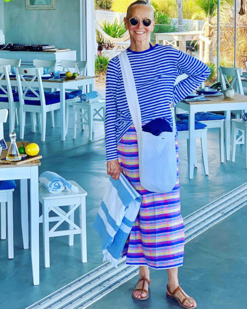 Juguler la féminité d'un jupon fleuri au contact d'une chemise blanche masculine (voir ici). Dénicher un cardigan dont l'épaisseur et la tenue permettront d'offrir à la notion de confort ses lettres de noblesse (voir ici - il s'agit ici du modèle Kennedy vendu dans sa boutique). Patiner le mix madras/rayures verticales en les travaillant en camaïeu (voir ici et là). Apaiser les all-over d'imprimés en chaussant une paire de sandales épurées (voir ici). Faire respirer les aplats de couleurs en laissant apparaître ici ou là une touche de blanc (voir ici). Réchauffer ses tenues sobres et androgynes au contact d'un long kimono en velours moiré (voir ici). Réhausser d'une pointe de jaune fluo un look affichant une tonalité verte (voir ici). Traiter le bandana comme un foulard chic (voir ici et là). Déjouer l'ampleur d'un cardigan et le volume d'un pantalon large en optant pour un sous-pull ultra moulant (voir ici). Continuer de porter des sandales en septembre (voir ici). Injecter une touche de dynamisme à ses costumes monochromes en chaussant une paire de baskets (voir ici). Faire la part belle au duo caramel/vert céladon (voir ici). Déjouer la dimension potentiellement poussiéreuse du mix kaki/tweed en optant pour une ou deux pièces casualwear (voir ici). Sublimer ses cheveux blancs en misant sur des dégradés de bleus et des matières naturelles/chaleureuses/nobles (voir ici).