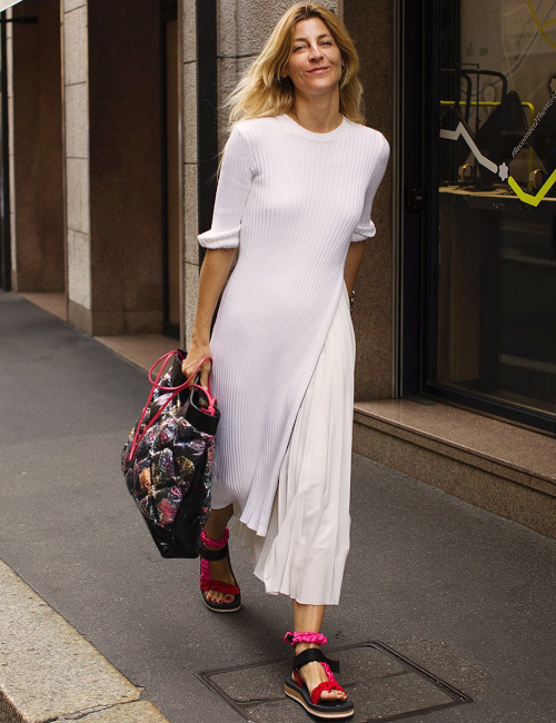 Incorporer un tee-shirt blanc bien coupé au sein de ses tenues féminines les plus chics (voir ici). Sophistiquer le trio chemisette ouverte/marcel/bermuda en nouant un petit foulard autour du cou (voir ici). Réhabiliter l'éventail (voir ici). Apaiser l'aura d'un top cropped en l'associant à une sage jupe midi plissée et à une simple paire de tongs (voir ici). Miser sur un subtil mix and match de textures pour sublimer le trio mastic/blanc/bleu ciel (voir ici). Associer chemise boutonnée haut et accumulation de colliers en perles de rocaille (voir ici). Marier pardessus camel et sweat gris (voir ici). Insuffler un peu de fantaisie à un ensemble short/chemise façon pyjama en lui adjoignant un top imprimé très coloré (voir ici). Souligner la taille de ses jupes midi via une large ceinture (voir ici). Mixer les imprimés en restant dans une même harmonie de couleurs (voir ici). Faire de ses lunettes de vue le "game changer" de ses tenues (voir ici et là). Glisser un gilet matelassé kaki sous un caban (ou autre manteau bleu marine) (voir ici). Casualiser un trench camel en lui associant un sweat jeté sur les épaules et une casquette de baseball (voir ici). Marier bleu azur et brou de noix (voir ici). Provoquer un effet d'optique "élongateur de jambe" en optant pour des chaussures ultra décolletées laissant libre la cheville (voir ici et là). Réveiller les teintes marron via une touche de violet/lavande (voir ici). Mixer encore et toujours les imprimés fleuris (voir ici).