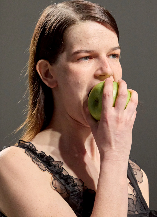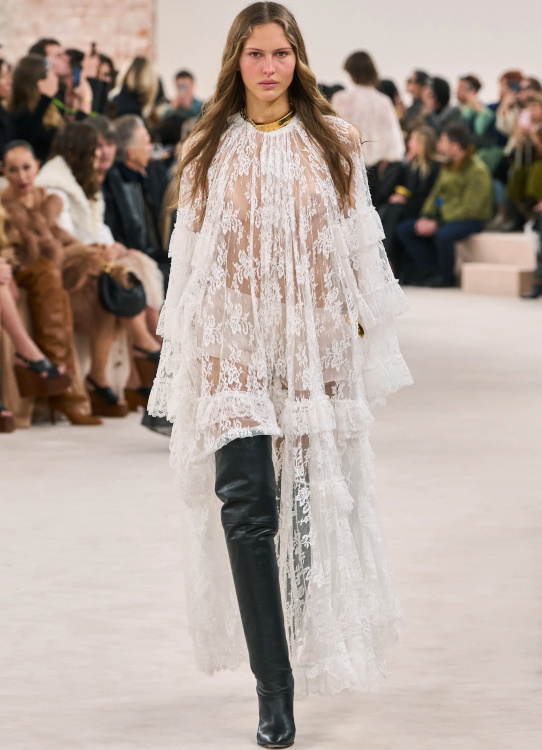 Si Dries Van Noten est ici loin d'avoir livré sa meilleure collection, certains de ses combos de couleurs n'en demeurent pas moins de belles sources d'inspirations, à l'instar du mix rose saumon/rouge/bordeaux, du trio parme/rose clair/bleu jean ou encore de l'ensemble camel/rose saumon/bleu jean. La chemise à carreaux "fenêtres" pourrait bien détrôner prochainement son homologue à rayures (Dries Van Noten). Sous la houlette de Chemena Kamali, la femme Chloé renoue avec l'ADN bohème qu'avait célébré Karl Lagerfeld, mais aussi Stella McCartney (voir ici et là). Les robes en mousseline se glissent de manière asymétrique dans les cuissardes (Chloé). L'escarpin à franges peine à séduire (Chloé). À défaut de créer des vêtements mémorables, Nicolas di Felice attire l'attention en munissant certaines de ses tenues d'une poche kangourou apparemment destinée à faciliter l'onanisme féminin (Courrèges). Julien Dossena s'essaie au layering avec plus ou moins de succès (Rabanne). Les collants plumetis gagnent en relief (Rabanne). Commercialement élégant, l'opus Givenchy aurait pu être bien pire étant donné l'absence actuelle de directeur artistique (voir ici et là). Les mannequins du show Cecilie Bahnsen nous invitent à laisser tomber les snacks hyper protéinés au profit d'une belle pomme verte (voir ici). Chez Acne Studios, on imagine le vêtement 3 en 1 : robe/manchon/sac (voir ici).
