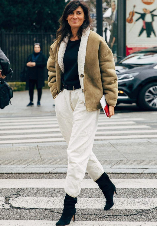 Le choisir oversize afin d'apporter de la densité à la tenue (voir ici). Privilégier les longueurs 7/8 permettant d'alléger la silhouette (voir ici). Le marier au mix bistre/rayures verticales bleu et blanc (voir ici). Ne pas mixer jean longueur feu de plancher et ample manteau longueur sous genou (voir ici). Le faire cohabiter avec les différentes versions saisonnières de la veste Carhartt (voir ici). Le travailler en trio avec les teintes marron et lilas (voir ici). Rehausser le mix ample peau lainée/jean large 7/8 au contact d'accessoires bordeaux (voir ici). Éviter de le choisir dans un blanc trop éclatant (voir ici). Le conjuguer sur une note "trappeur excentrique" (voir ici). Associer ses versions larges (ou carrot) à des manteaux plutôt courts (voir ici et là). Le glisser dans une paire de bottes souples (voir ici). Préférer le gris au camel pour accompagner le duo noir et blanc (voir ici). Ne pas hésiter à lui insuffler une dimension cosy en chaussant des mules fourrées (voir ici, ici et là). L'incorporer au sein de camaïeux de beige/camel, le tout servi par un mix and match de textures (voir ici et là). Lui offrir une dimension néo bourgeoise en le réchauffant au creux d'un manteau 3/4 sans col en fausse fourrure (voir ici). Choisir ses manteaux teddy bear deux teintes au-dessus de celle du pantalon (voir ici). Lui marier marinière et peau lainée (voir ici). Le faire cohabiter avec un marron ultra foncé (voir ici et là). Révéler son style seventies en lui associant long trench et chemise à rayures (voir ici).