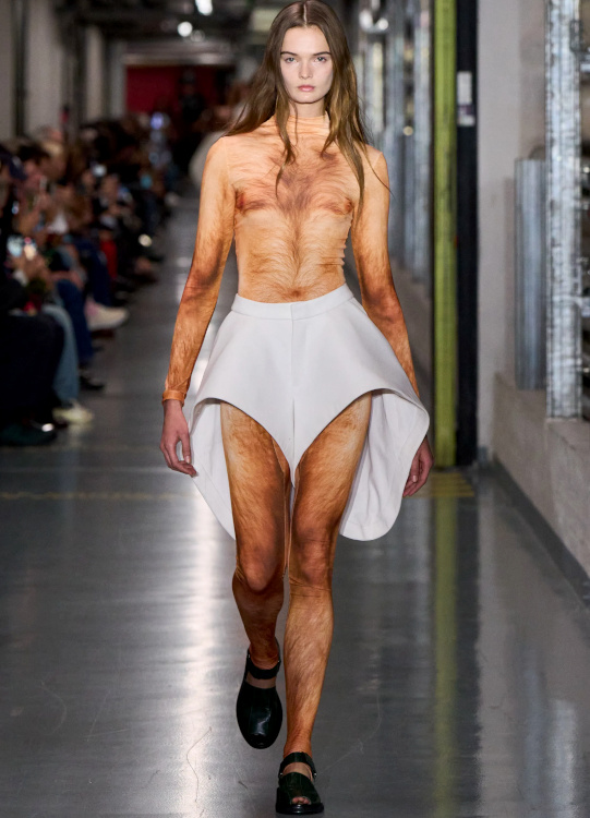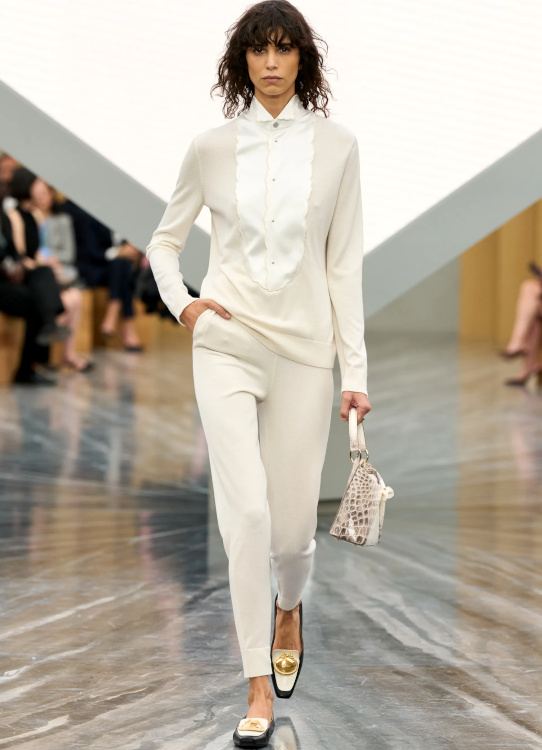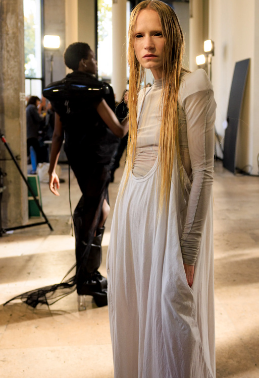 Si elle s'avère moins percutante que l'opus masculin, la première collection Dior femme signée Jonathan Anderson n'en demeure pas moins prometteuse. Le créateur de 40 ans prouve en effet qu'il ne se laisse pas intimider par le poids de l'héritage Dior en nous en livrant une lecture personnelle, nourrie de sa propre grammaire stylistique (voir ici, ici et là). La partition est encore hésitante (voir ici, ici et là) et l'équilibre entre audace, casualness, désirabilité immédiate et aventure cérébrale reste à affiner, mais les fondations sont là. Au final, mon envie de voir s'épanouir la femme Dior selon Jonathan Anderson n'a jamais été aussi vive : l'homme qui imagina la robe du passage 33 (voir ici et là) ne peut en effet qu'être capable du meilleur… Faussement simple, le duo blouson légèrement oversize + mini-jupe rose layette fait mouche chez Victoria Beckham (voir ici). Je me demande si Rick Owens, Duran Lantink et Glenn Martens ont fréquenté le même pensionnat cauchemardesque, s'ils participent à des réunions occultes dans les catacombes et s'ils mangent des oisillons morts au petit-déjeuner. Difficile en effet d'expliquer autrement la teneur de leurs collections respectives… (voir ici, ici et là) Stella McCartney nous prouve qu'il suffit de peu de choses pour transformer un "no look" en silhouette impactante (voir ici). Heureuse de retrouver chez Loewe les créateurs Jack McCollough et Lazaro Hernandez qui, après m'avoir cruellement laissés sur ma faim lors des dernières collections Proenza Schouler, semblent avoir récemment ingurgité un élixir de jouvence créatif (voir ici, ici et là).