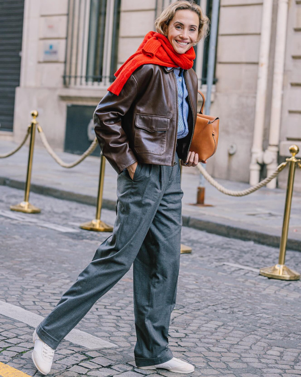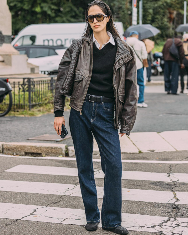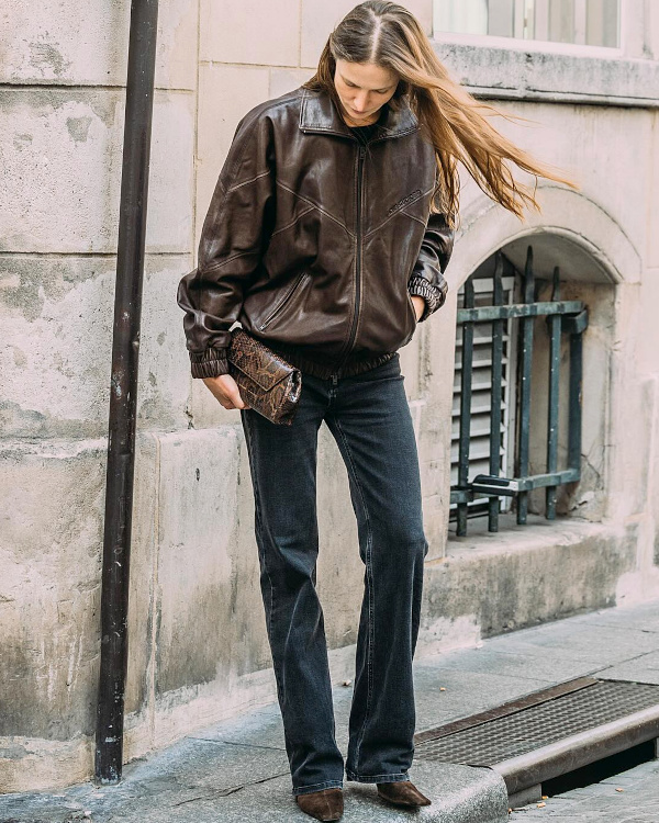 Faire du tandem blouson en cuir marron/jean droit sombre son nouveau duo de prédilection (voir ici et ).