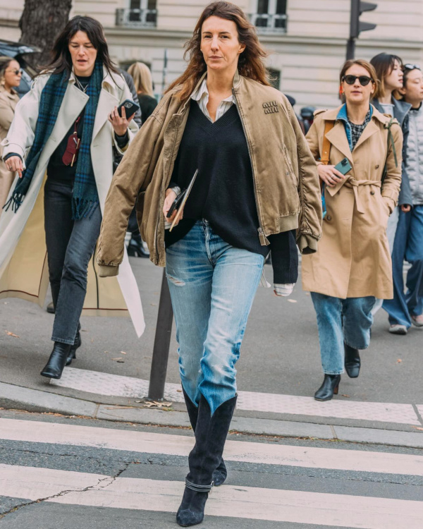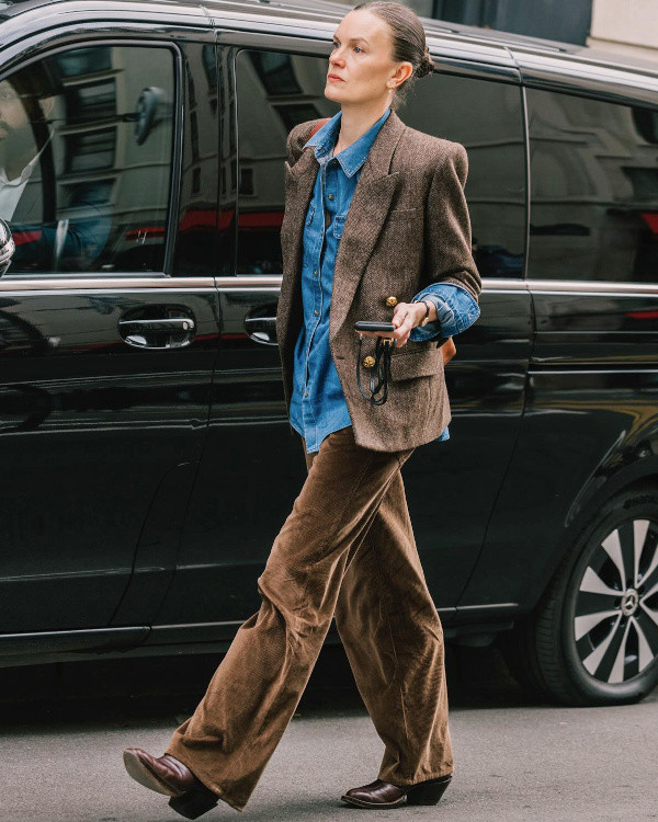 Glisser une chemise en jean sous son blazer en tweed marron (voir ici).