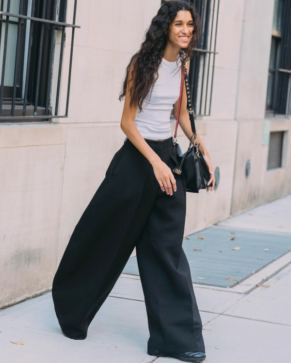 Marier le sérieux du pantalon noir à pinces au style seventies du blouson en daim marron (voir ici).