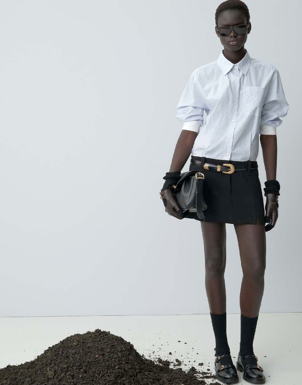 Mixer chemise "working girl" et jupe taille basse (Sandro).