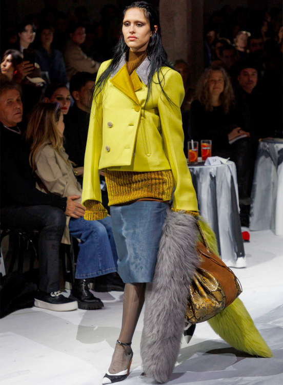 Pimenter d'une touche de jaune les camaïeux de marron ou de gris (Miu Miu, Victoria Beckham).