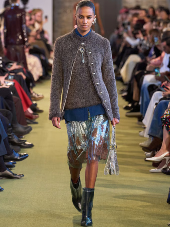 Déjouer la dimension BCBG du twin-set en lui associant une jupe texturée et scintillante (Rabanne).