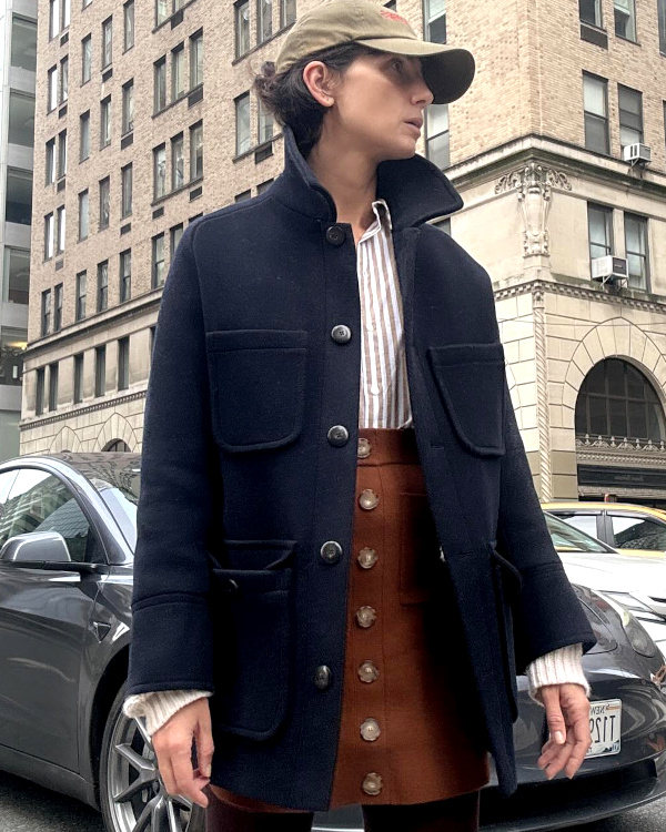 Dédramatiser le port de la veste boxy chanelienne via une casquette kaki (voir ici).