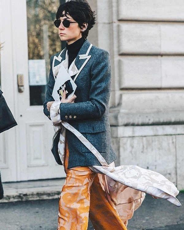 Dérider un blazer structuré au contact d'un pantalon imprimé fluide (voir ici).