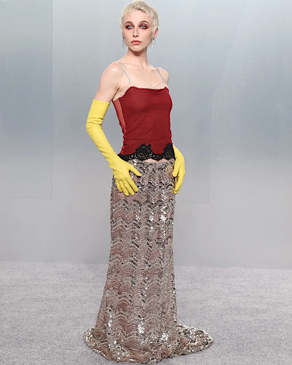 Zendaya troqua ici un peu de sa flamboyance au profit d'une allure plus mûre. Malheureusement, si le brun taupe de sa robe s'inscrit parfaitement dans les tendances actuelles, il paraît moins évident dès qu'il s'invite sur une robe du soir (Zendaya en Louis Vuitton). Les bustiers qui remontent haut sur la poitrine tout en s'en détachant légèrement sont à double tranchant : ils peuvent apporter à la silhouette une modernité mordante ou, au contraire, susciter un léger malaise visuel. Celui de Kirsten Dunst appartient malheureusement à la seconde catégorie… (Kirsten Dunst en Céline) Quand un corps dégage déjà une sensualité manifeste, la sobriété est souvent le choix le plus juste. À vouloir trop souligner ce qui saute déjà aux yeux, on risque de perdre en harmonie comme en subtilité… (Teyana Taylor en Chanel) Quand les sequins conjuguent minimalisme et effet liquide, que le dos nu se fait vertigineux tomber dans la vulgarité et que la ligne s'en tient à une épure très féminine, alors apparaît l'une des plus belles robes de la soirée : celle signée Louis Vuitton pour Emma Stone. Le respect des proportions est la base d'un look réussi. Une évidence que certains stylistes semblent volontairement ignorer (Gracie Abrams en Chanel). Que penser d'une robe qui, de face, frôle l'ennui, mais qui, de côté, se révèle aussi audacieuse que conceptuelle ? Peut-on vraiment aimer une tenue sous un seul angle ? Et si c'est le cas, n'est-ce pas le signe qu'elle n'est pas tout à fait aboutie ? À moins que la sobriété presque fade du devant ne soit précisément ce qui rend la vue de profil si saisissante… (Gwyneth Paltrow en Armani) Sur les tapis rouges, les duos parent-enfant relégueraient presque au second plan les considérations stylistiques, tant le lien qui les unit se révèle touchant (voir ici et là). Miser sur la nonchalance, oui. Sur l'illisibilité, non (Odessa A'zion en Valentino).