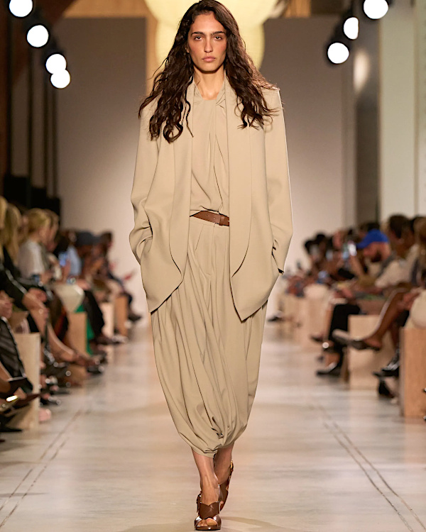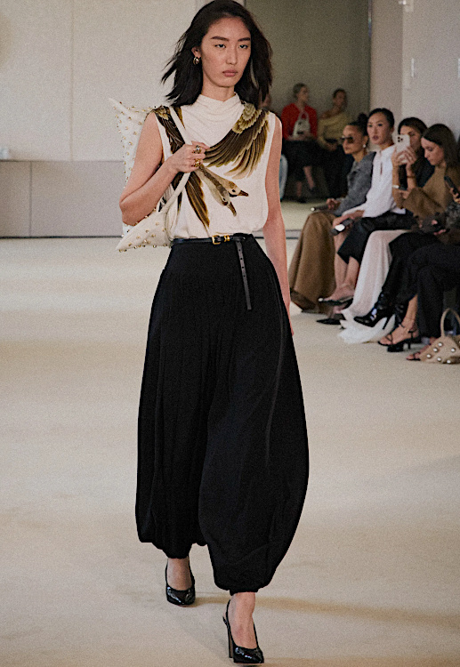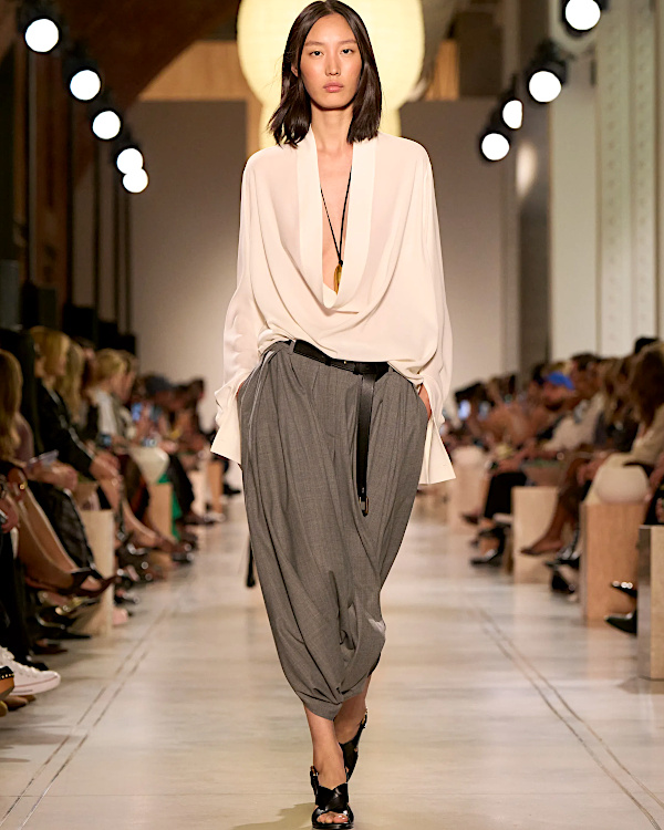 Avec son ADN boudoir à la Paul Poiret, le pantalon bouffant ultra-large gagnera à éviter les tops évoluant dans le même registre, sous peine de verser dans un premier degré "homewear" (Dior). Les volumes balloon XL fonctionnent particulièrement bien avec la toile denim, surtout lorsque le jean en question est associé à une veste cintrée, dessinant une ligne sablier à l'élégance très contemporaine (Dior). Bouffants et sophistiqués, les pantalons harem aiment être associés à des vestes ou blousons courts, capables d'offrir à la jambe un maximum de longueur. Attention toutefois aux détails trop imposants placés sur le devant (comme chez Dior), qui risquent de brouiller la lecture de la silhouette (Dior). Lorsqu'il se voit décliné dans des textures très "soir", le pantalon harem devient un candidat idéal au télescopage de styles. L'associer à des éléments graphiques très éloignés de son ADN - à l'image de cette chemise à carreaux sage - est ainsi une excellente idée (Dior). Les pantalons bouffants apprécient de voir leur volume dompté par un brin de structure : on oublie donc le large sur large… (Chloé, Altuzarra) À partir du moment où le top accompagnant le sarouel, le pantalon balloon ou toute autre variation du modèle barrel est étroit et légèrement court, il peut se permettre d'audacieux partis pris graphiques sans risquer de déséquilibrer la silhouette (Chloé). Attention : taillé dans une popeline de coton blanche un brin cassante, le pantalon bouffant peut vite perdre cette nonchalance qui fait tout son charme (Louis Vuitton). Taillé dans un tissu plus "working girl" que "Mille et Une Nuits", le pantalon sarouel drapé insuffle une touche d'exotisme maîtrisé aux tenues de ville (Michael Kors). Inséré dans un monochrome sable à l'esprit tailoring nonchalant, ce type de pantalon apportera juste ce qu'il faut de fraîcheur et de nouveauté à des looks d'ordinaire légèrement trop sages (Michael Kors). Le pantalon sarouel oversize à l'entrejambe descendue gagne à être porté avec des sandales à talons, qui permettent d'allonger la silhouette tout en contrebalançant son ampleur généreuse (Michael Kors, Altuzarra). Souligner la taille d'un pantalon balloon avec une fine ceinture permet de structurer subtilement la silhouette (Altuzarra). La version satinée des "harem pants" privilégiera des hauts mats et structurés (voir ici).